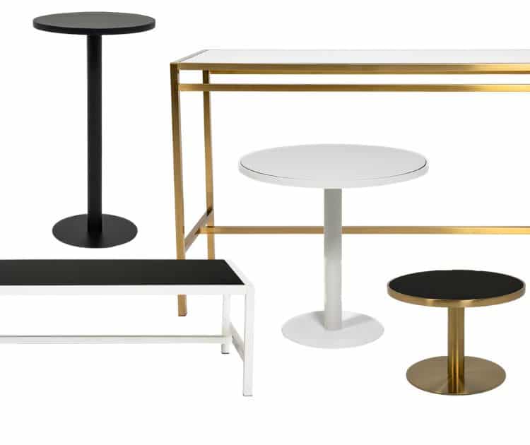 Atlas is modern minimalism; where the simplicity of shape is celebrated in interchangeable black, white and gold leg and top options. Available in cocktail, cafe, tapas and coffee tables, Atlas shapes stand on their own as a statement of minimalism, or easily blend with a range of themes.