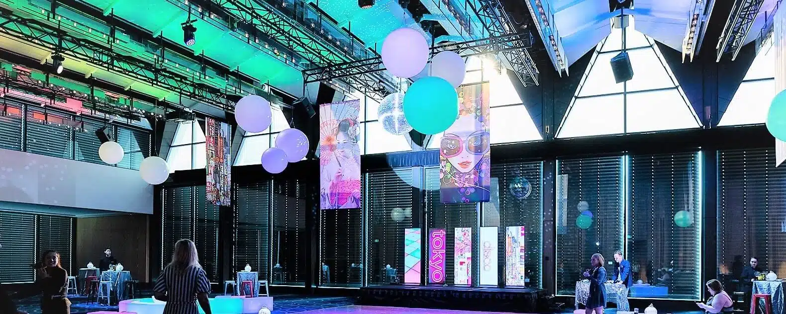 Using a mixture of hanging spheres, disco balls, banners and signage, we were able to convey the quirky yet colourful theme to the clients delight.